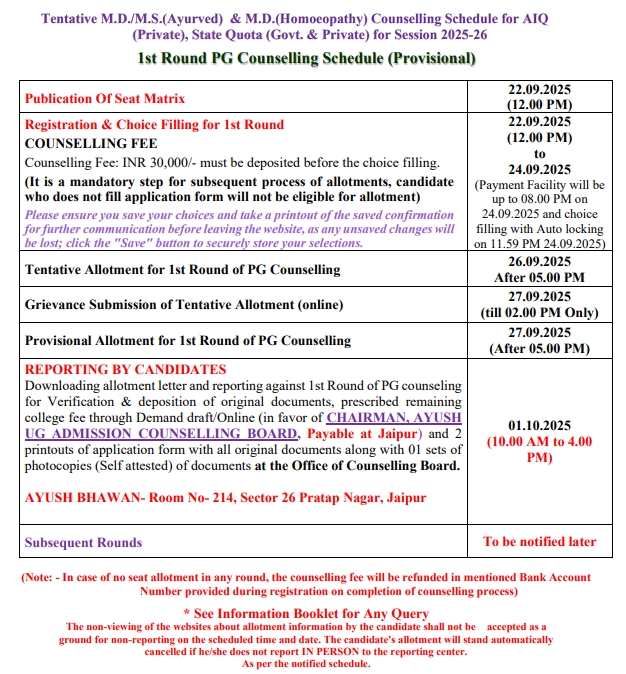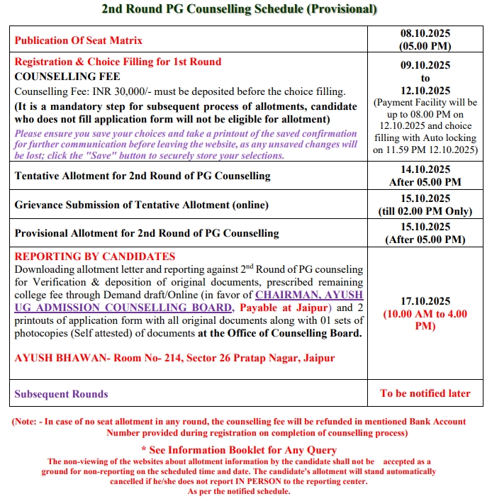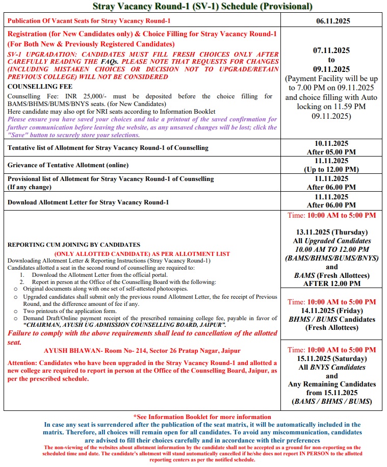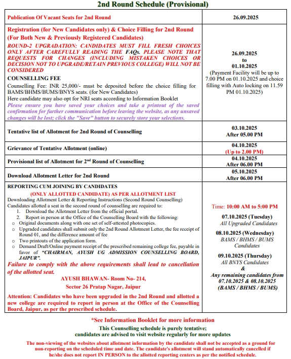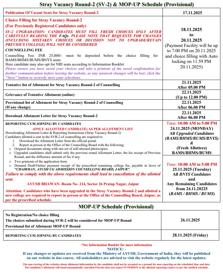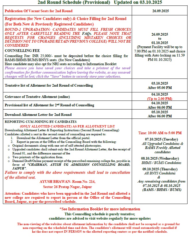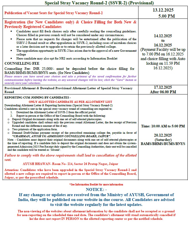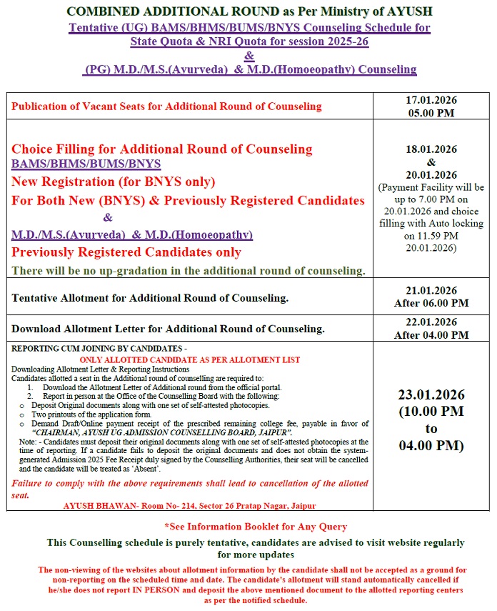 All the candidates are hereby informed that all the activities of admission described here can be performed within the stipulated time limit as declared by the Admission Committee for RAJASTHAN NEET AYUSH UG / PG COUNSELLING BOARD and refer the admission schedule declared by RAJASTHAN NEET AYUSH UG / PG COUNSELLING BOARD from time to time.